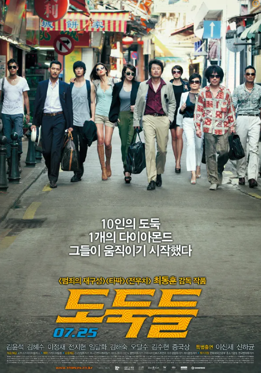 『도둑들』은 2012년 7월 개봉하여 12,983,624명의 관객을 동원하며 한국 영화 역사상 흥행 TOP 10에 이름을 올린 범죄 액션 영화입니다. 범죄극 특유의 긴장감과, 배우들의 연기 앙상블, 이중 삼중의 반전으로 관객들의 이목을 사로잡았고, 무엇보다 한국과 홍콩 톱스타들이 함께한 블록버스터로 큰 화제를 모았습니다.